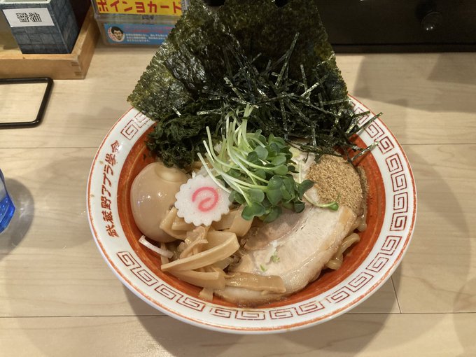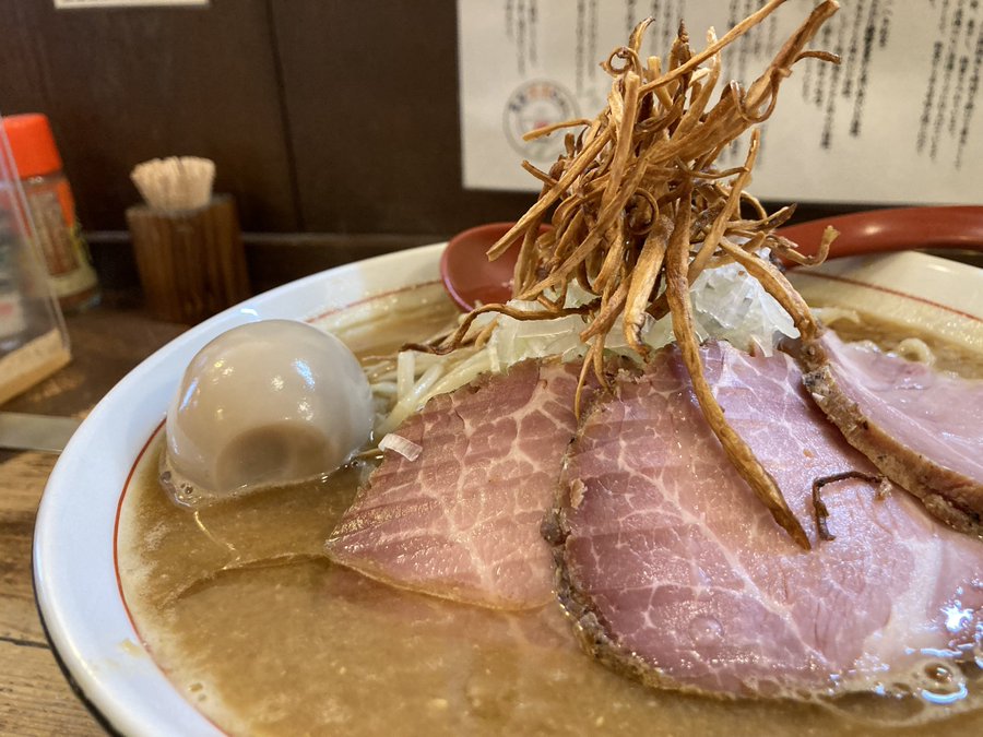 前述のすごい煮干しラーメン凪で修行した店主が国分寺にオープンさせたお店で、すごい煮干しラーメン凪のラーメンよりはマイルドに、より煮干しをもっと広げようとかどを取って少し丸くして、この近くの人に愛されるように工夫されたスープと麺、そしてすごい煮干しラーメン凪から受け継がれた超極太の麺もあり、最後まで飽きさせない工夫がされていると思います。